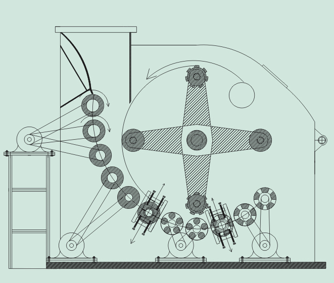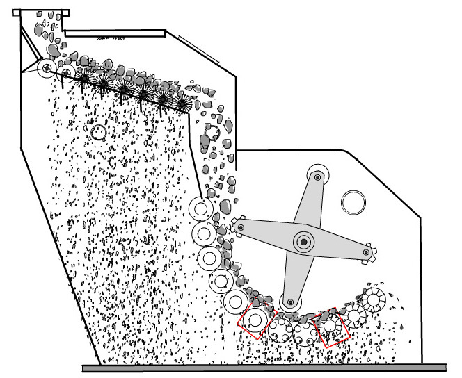 破碎物料進(jìn)入粗破的形式,由粗輥與反擊板相互刮削打擊運(yùn)動(dòng)使大塊物料破碎,然后進(jìn)入篩分系統(tǒng)達(dá)到粒度要求的直接送進(jìn)鍋爐,未過(guò)到要求粒度的再進(jìn)行到細(xì)破置進(jìn)行破碎,兩細(xì)破輥?zhàn)酉鄬?duì)差速運(yùn)轉(zhuǎn),具有相互刮削作用而強(qiáng)制排料,采用原料自由落差,全進(jìn)全出,對(duì)物料水分無(wú)任何要求。