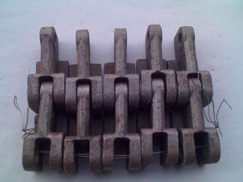 鱗片式爐排適用于蒸發(fā)量10~60t/h的鍋爐.其爐排面通常由4~12根互相平行的鏈條(類似自行車上的鏈條結(jié)構(gòu))組成.每根鏈條用鋤栓將若干個由大環(huán)、小環(huán)、墊圈、襯管等元件組成的鏈條串在一起.往復爐排通過夾板組裝在鏈條上,前后交疊,相互緊貼,呈魚鱗狀。